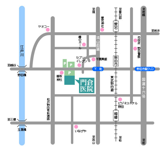 ホームアクセス アクセス 医療法人社団桃和会 門倉医院〒278-0033千葉県野田市上花輪628番地の1【TEL】04-7124-5311【FAX】04-7124-5314 外観 簡単マップ 外観 簡単マップ 1/1 千葉県野田市 千葉県流山市 埼玉県北葛飾郡松伏町 埼玉県吉川市 埼玉県春日部市 メディカルフィットネス フィットネスクラブ スポーツジム ※当院は、周辺県からも簡単にアクセスでき、県外からもご利用いただきやすい立地に位置しています。